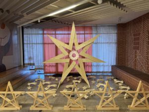 Unser Weihnachtsprojekt 2025 stand unter dem Motto „Advents-stern“. Die Zimmerer der Klasse ZIM10 durften diesmal einen großen Stern mit sieben Strahlen am Freitag vor dem ersten Advent aufstellen. Nachdem am Vortag alles hergerichtet wurde, ging es mit Schubkarren, Werkzeug und wie immer mit dem Song „Ich und mein Holz“ über den Pausenhof in die Aula unserer Schule. Jeder wusste was zu tun war und so stand der Stern nach gut einer Stunde in seiner ganzen Pracht. Gekrönt wurde der Adventsstern mit einem runden Leuchtelement in der Mitte und mit in den Wochen vorher an der Bandsäge ausgeschnittenen Sternenschweifen und kleinen Holzsternen, welche sich am Boden vor dem Projekt verteilten. In der ganzen Adventszeit erfreuten sich die vielen Schüler tagtäglich an diesem schönen Anblick. Nach getaner Arbeit spendierte die Schulleitung der Klasse eine großzügige Brotzeit.